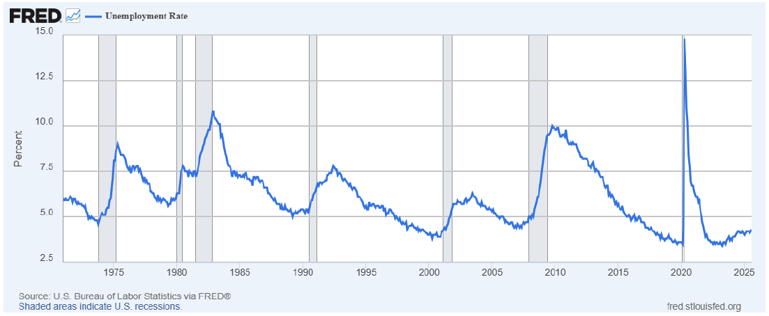 Let’s continue forward. What about the unemployment rate? Still at 4.3% as of August 2025 (see earlier chart), which is barely above the 4.1% rate this time last year and still represents the lowest unemployment rate we have seen in this country since 1970 save a few peak months over the last 55 years. If AI is coming to take all of our jobs away along with Sarah Connor, it apparently has not arrived just yet.