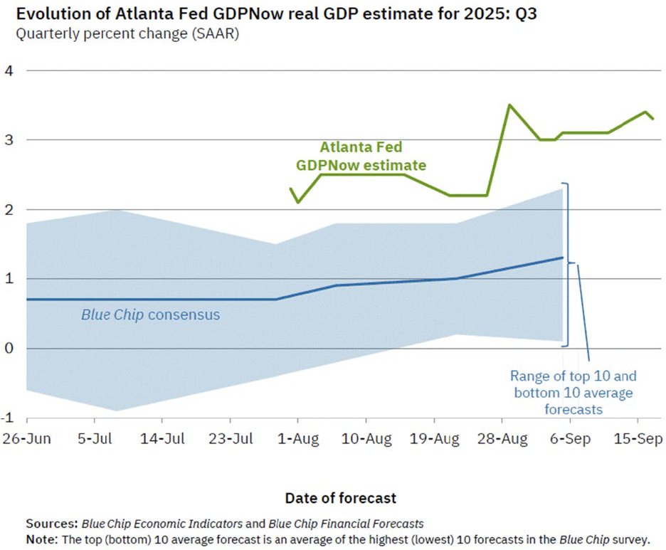 Let’s start with the economy. Despite worries about the recession in the U.S. that was supposed to arrive in 2022, then 2023, then 2024, and now 2025 but never, ever actually shows up, the U.S. economy remains strong. Consider the latest estimates for Real GDP growth for 2025 Q3. In a pattern we have seen repeat itself over and over and over again over the last several years, the actual data is signaling a much stronger economy than what the handwringing “Blue Chip” economist consensus is predicting how the economy will perform. For while the “experts” were projecting U.S. Real GDP growth will increase by less than 1% this quarter, the data signals that it is on pace to exceed 3% on a quarterly percent change basis. This is not only growth, but strong growth that continues to persist beyond expectations.