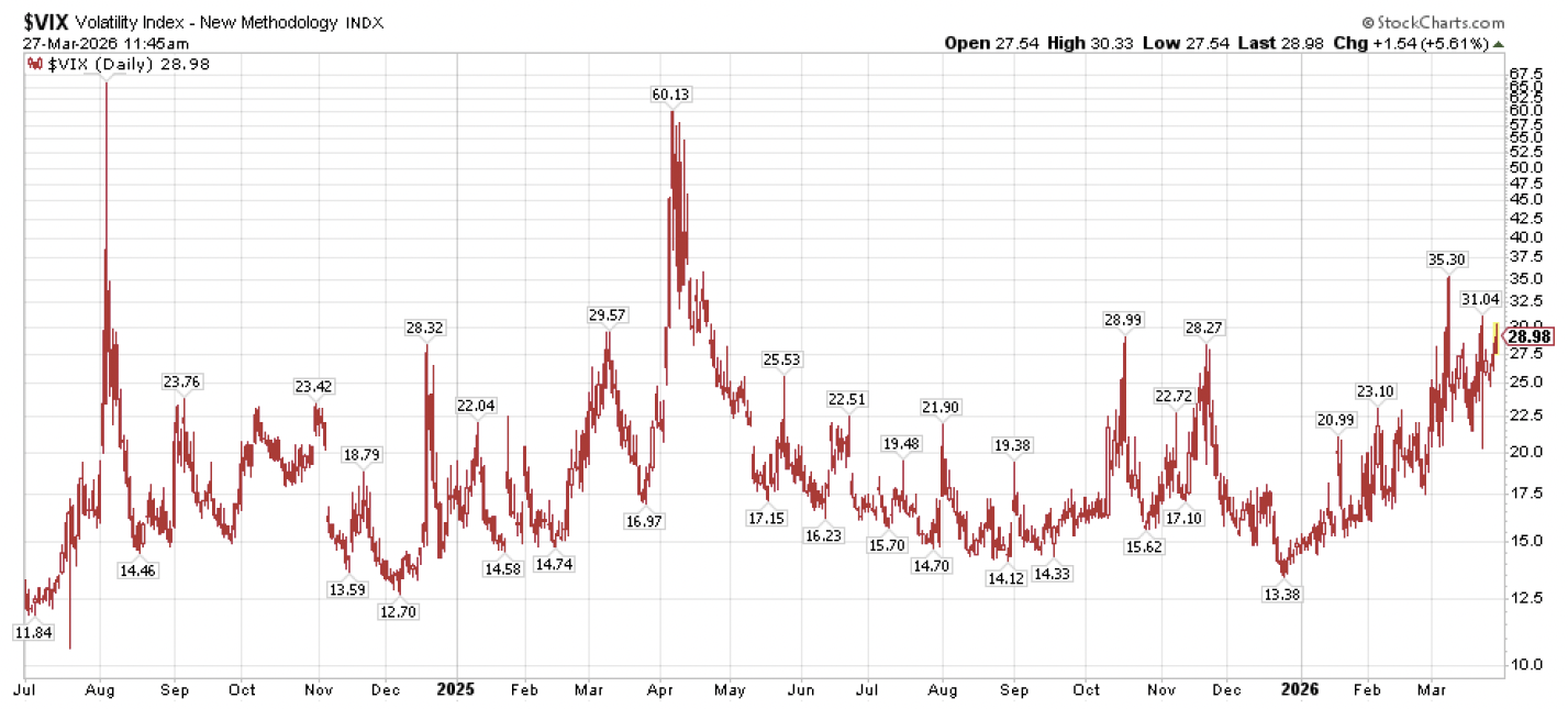 A different look at the market highlights the anxiety investors have been feeling lately. The CBOE Volatility Index, also known as the VIX as shown in the chart below, is a measure of market “fear” based on the price that investors are willing to pay for options contracts, presumably among other things to buy protection for their long stock portfolios. Since the sanguine days of the second half of last year where the VIX was trading below 15, we have been moving steadily higher throughout 2026 to readings above 30 in recent weeks.